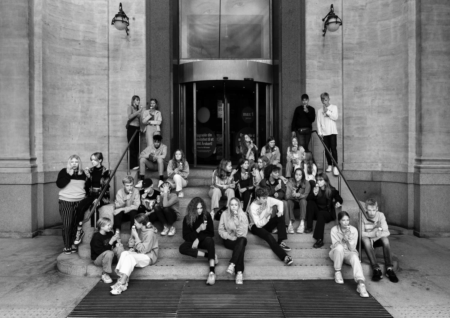 Above: Molly Haslund, Teenagers Eating Ice Cream Cones, Den Frie, 2025. Below: Sofie Hesselholdt and Vibeke Mejlvang, Be a beautiful force together. Photographed by Jens Panduro.