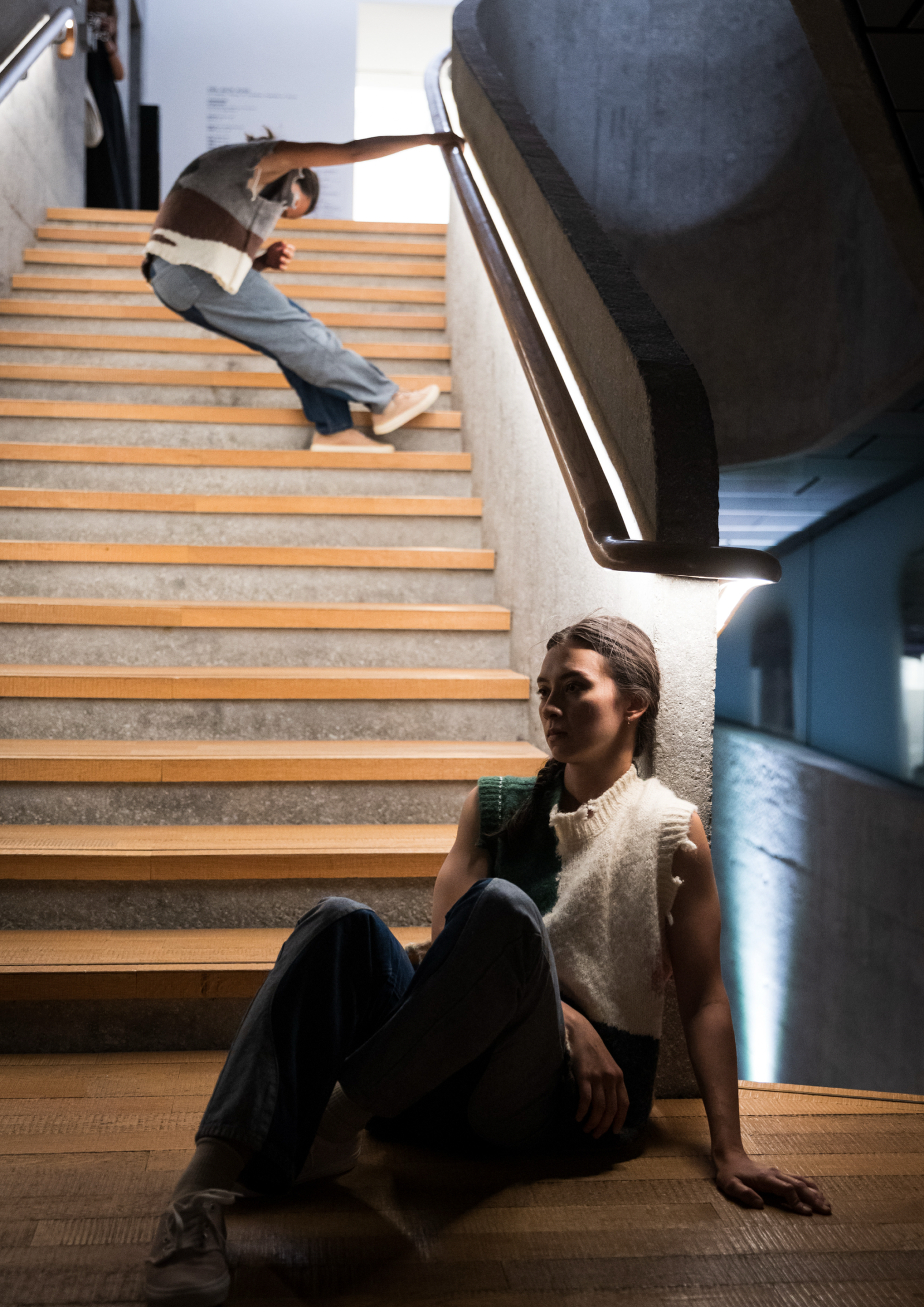 Arcilla: A staircase is designed to connect different levels of a building, enabling movement upward or downward. I am interested in what causes this functional purpose to momentarily dissolve when performers inhabit the space. In site-specific performance, the way spectators position themselves becomes a central concern. How can choreography invite viewers to watch from a distance, then draw them closer? How can movement quality persuade the audience to follow us, both spatially and temporally?