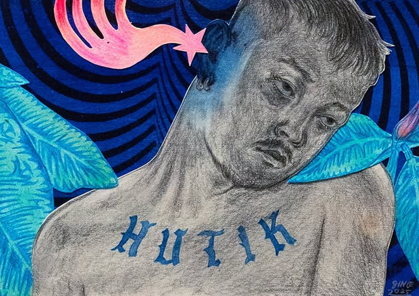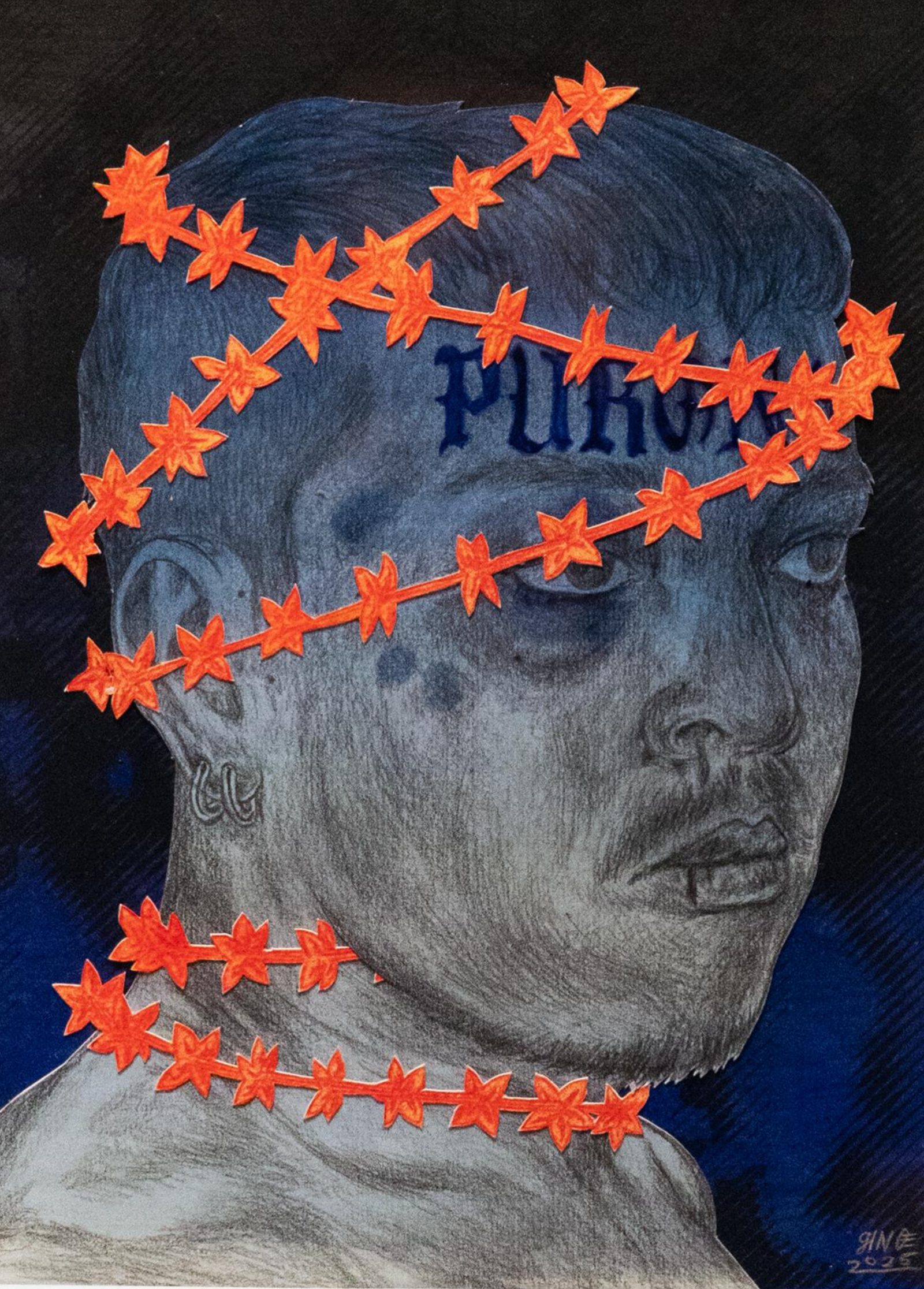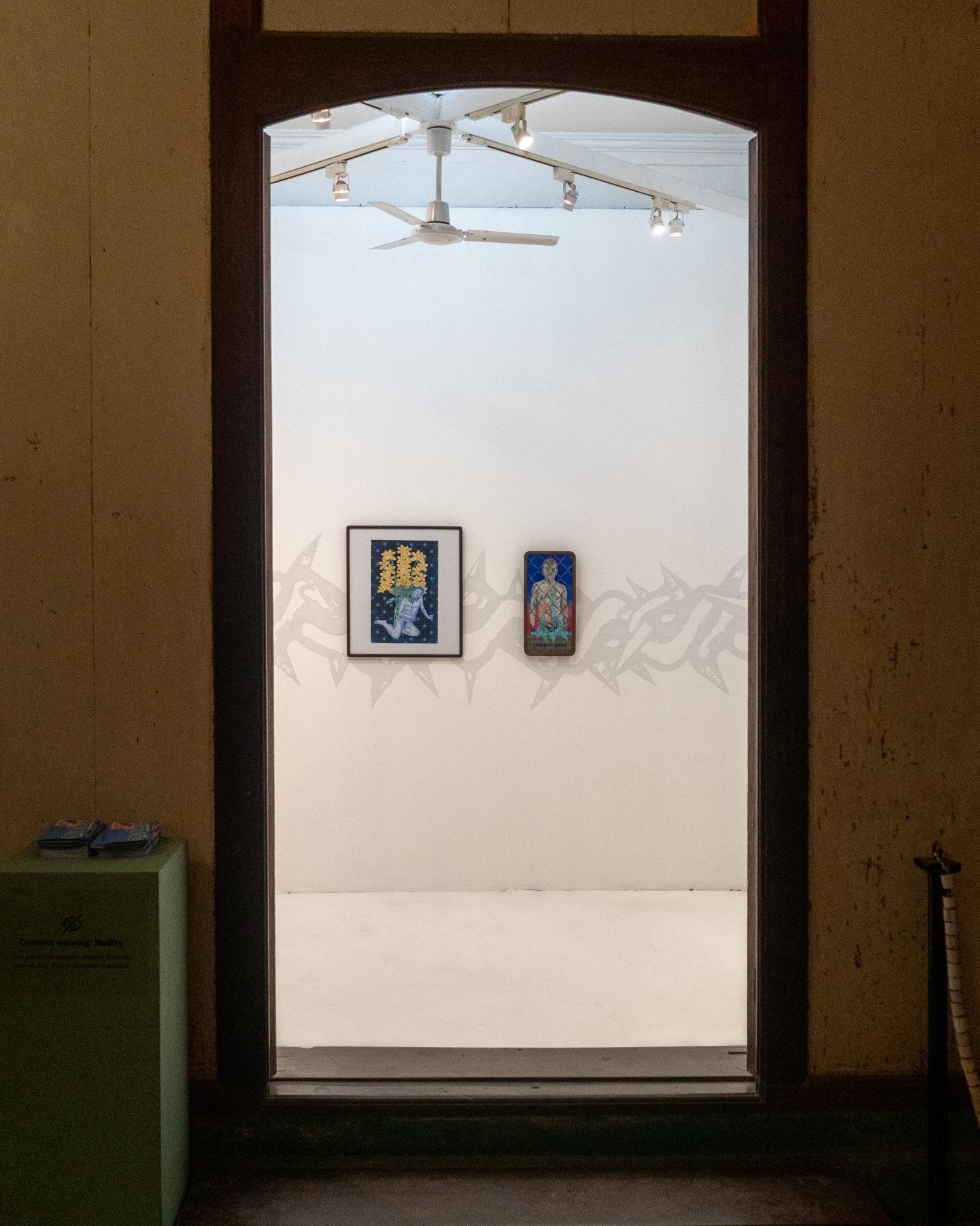 He has a work called Purong, translated as “crown” but also “cage”, which features Ginoe’s portrait covered in santan crowns as an adult with a bruised eye. The background of the work is a vintage illustration of boxers. This paints the memory of how his cousins used to ask him to box with other kids in the neighborhood so that he could prove he was not queer. To add, his only installation piece is a giant santan crown made of steel, a reflection of how he felt as a child.