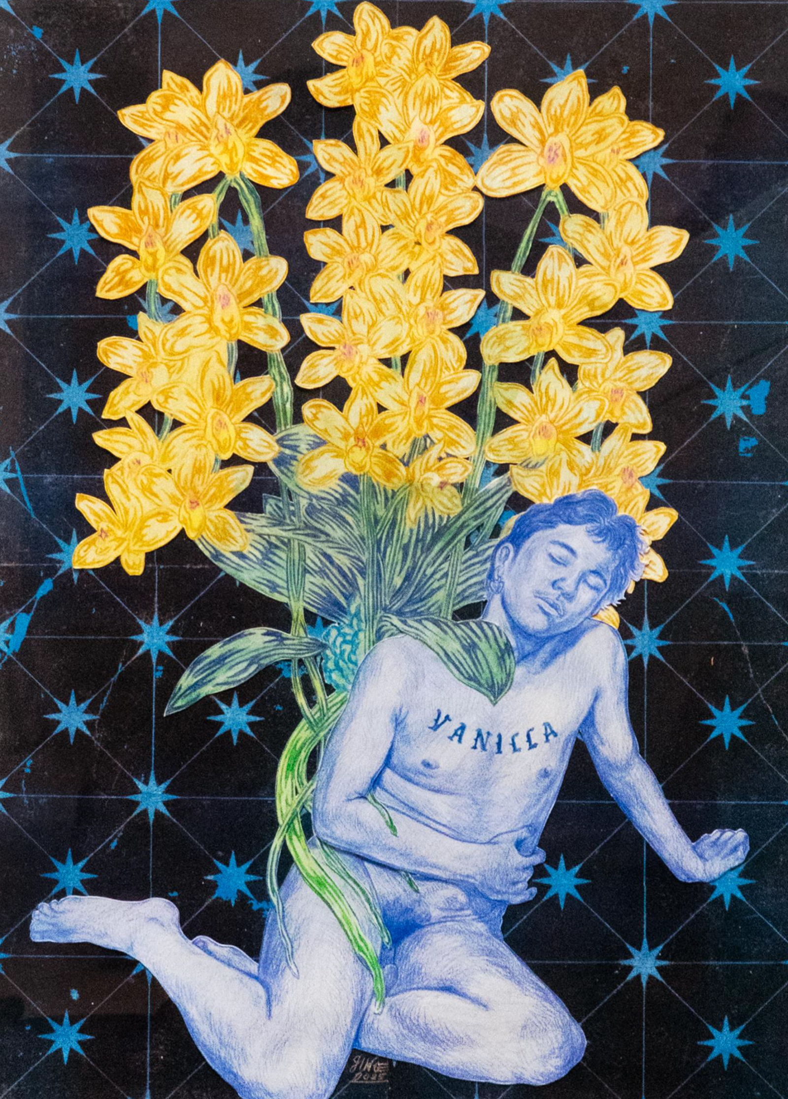 Some of the works reflecting on Ginoe’s life as an adult include a piece called Vanilla. Originally, he envisioned this as a work of himself and his lover seated on each other’s lap, with a vanilla orchid blooming from one of their crotches. The actual work is a portrait of his lover, Ron, reclining in the nude while a bouquet of vanilla orchids blooms behind him, drowning in a sea of blue.
