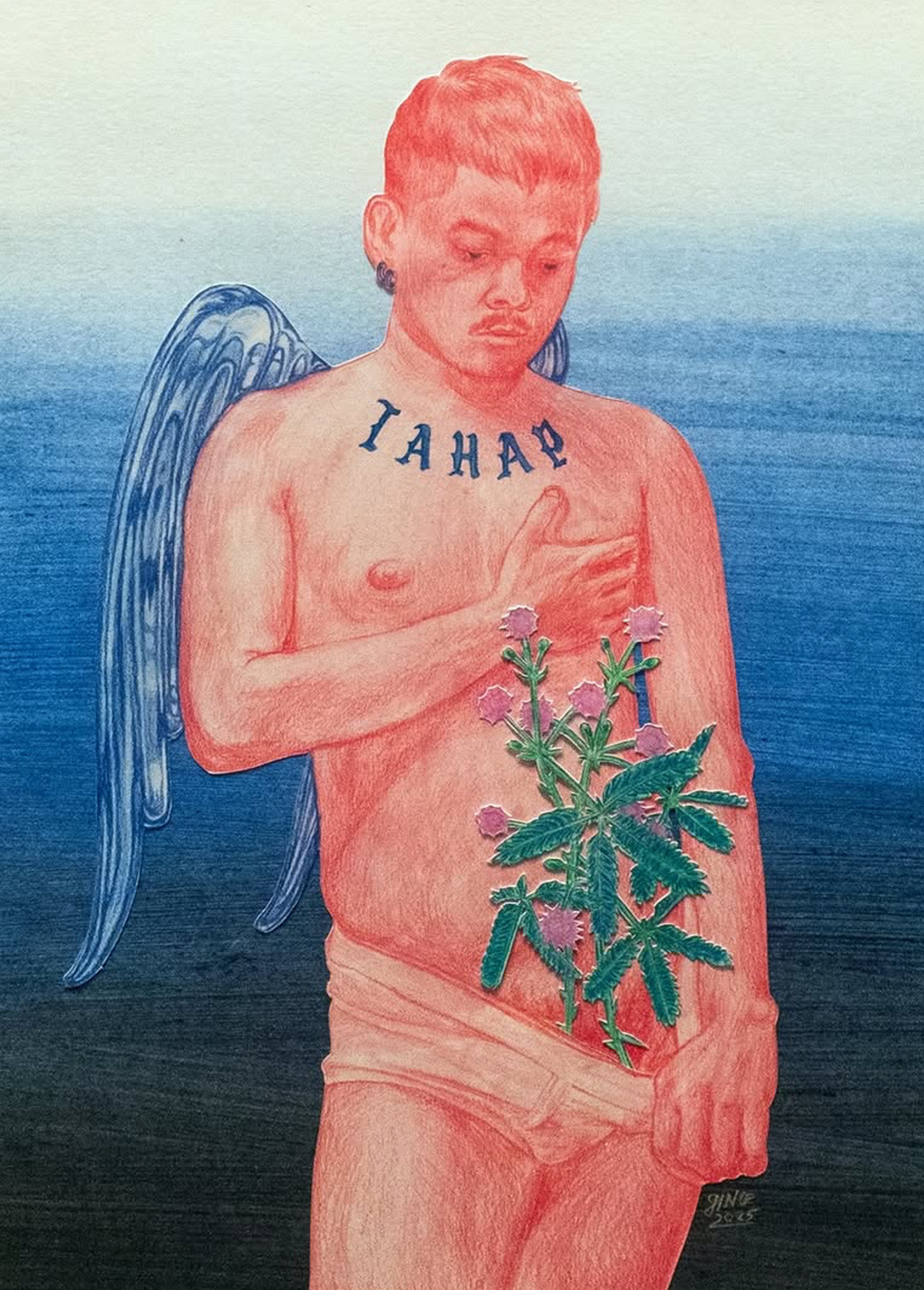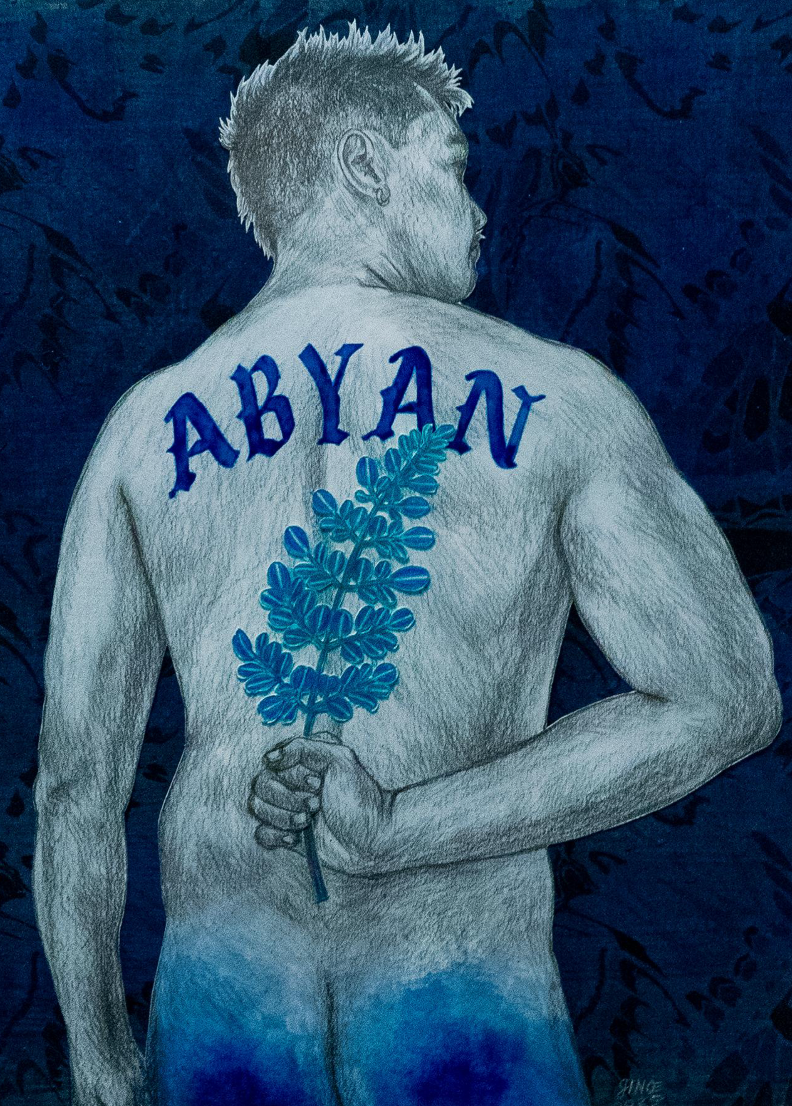 The artist explores the tenderness of adult friendships in Abyan, meaning friend, but is closer to comrade. The work features a nude figure of one of his dearest friends with his back turned, clutching a cluster of malunggay leaves. The pose mimics that of a lover hiding a bouquet behind his back as a surprise.