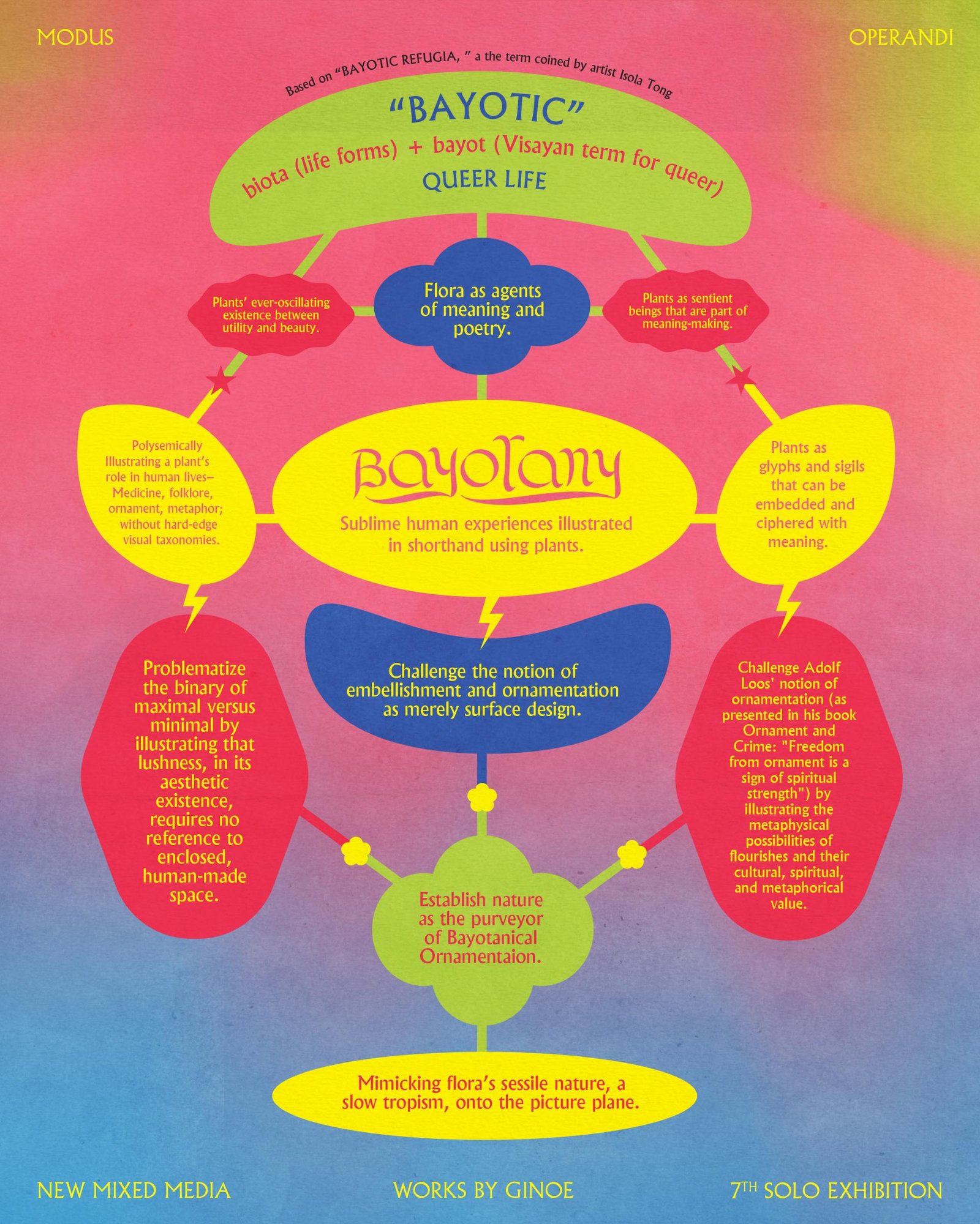 Bayotany emerged as the exhibition title when Isola Tong, an artist with Waray roots and Ginoe’s friend, did ecological research and coined the neologism bayotic refugia. It combines bayot, a Bisayan term for queer or femme and biota, the animal and plant life of a particular region.