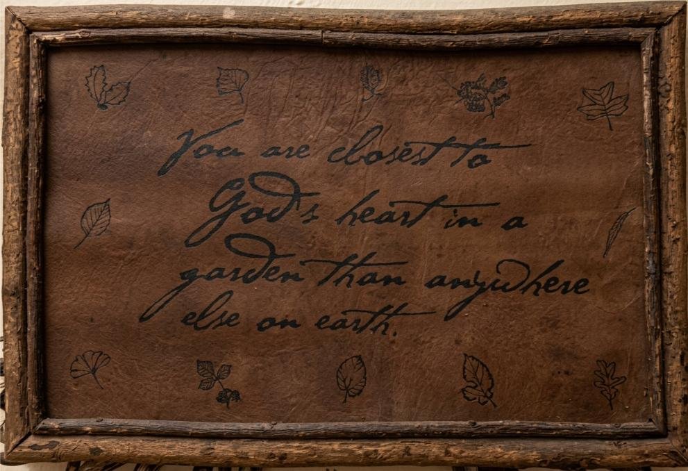 I remember one morning coming up to shower on the second floor, I came upon a square framed paper of a faded script with different leaves stamped on its border hanging on the door outside their family room: You are closer to God’s heart in a garden than anywhere else on earth.