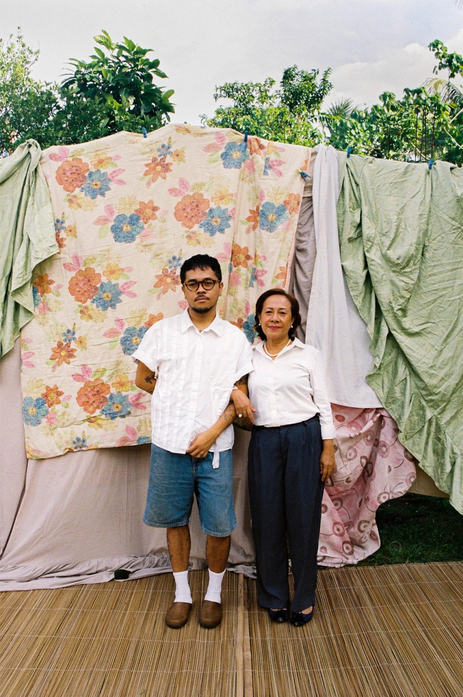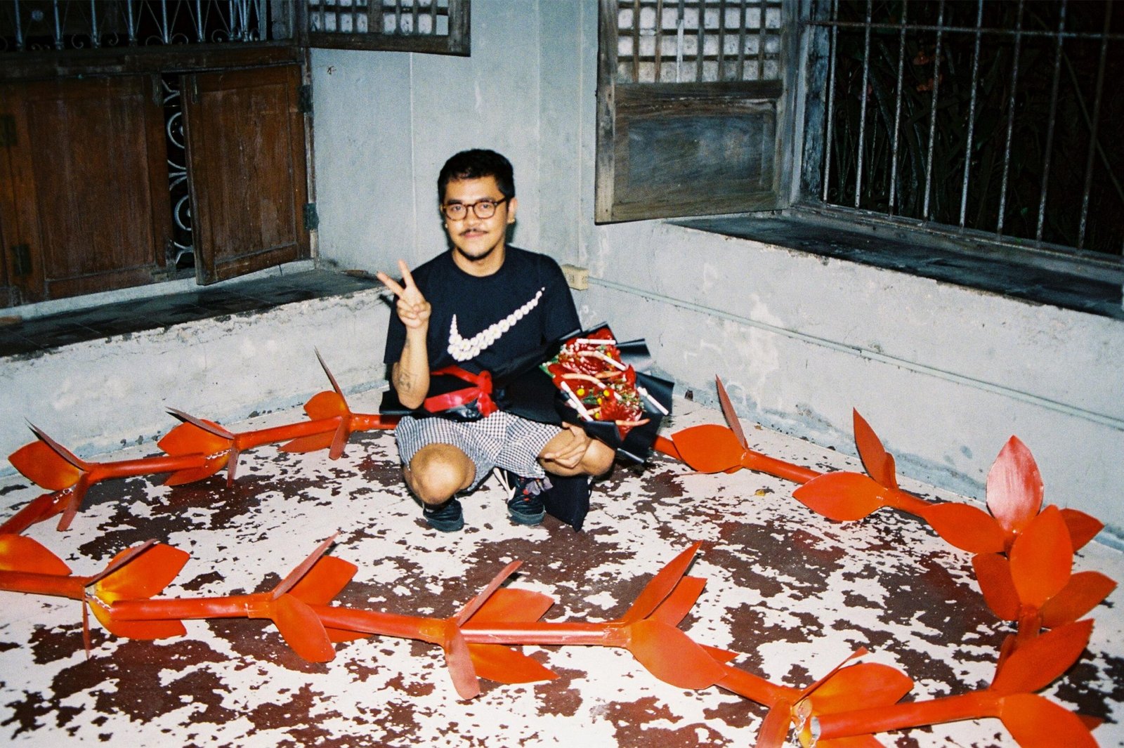 Beyond its romantic connotations, “Sumpa Kita” can also be interpreted as a curse. In Ginoe’s experience, queerness is perceived as a curse his mother cannot lift and an everlasting worry. Being covered in sampaguita makes him look beautiful and fragrant to the public, yet the weight of the wreaths hinders his movement and obscures his vision. The backdrop features a sampaguita glass, a repeated pattern illustrating the reality of having to walk on glass in order to navigate society.