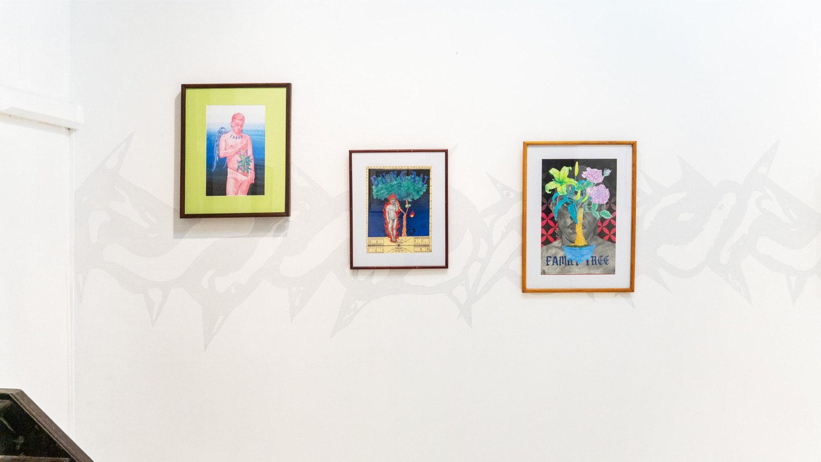 Above: Family Tree, Mixed media collage on paper, 2025 and Tahap, Mixed Media Collage, Found Frame, 2025. Below: Exhibition view of “Family Tree.” Photo by Nicolas Tolentino.