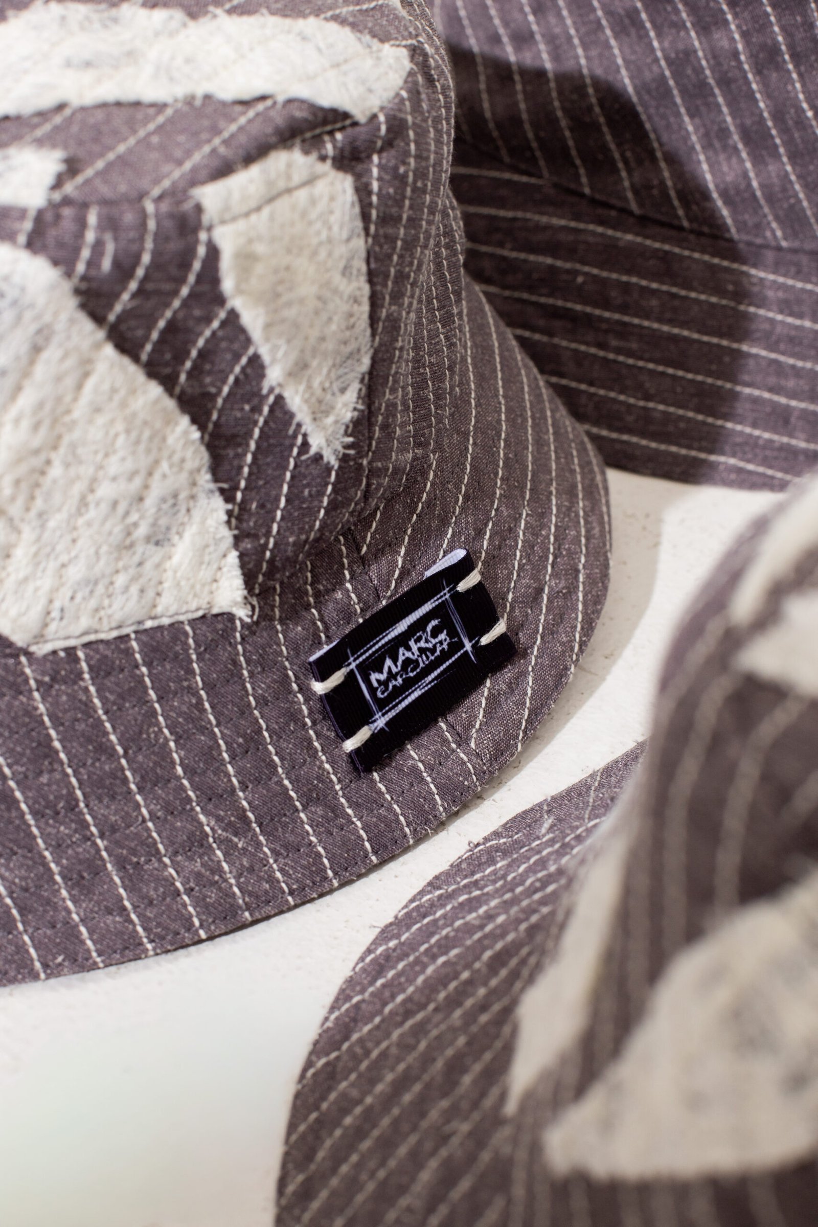 The Fill in the Gap bucket hat series is made from Hiblatech’s dark gray woven fabric, top-stitched with rugged threads, and embellished with tulle-laminated Hiblatech yarns.