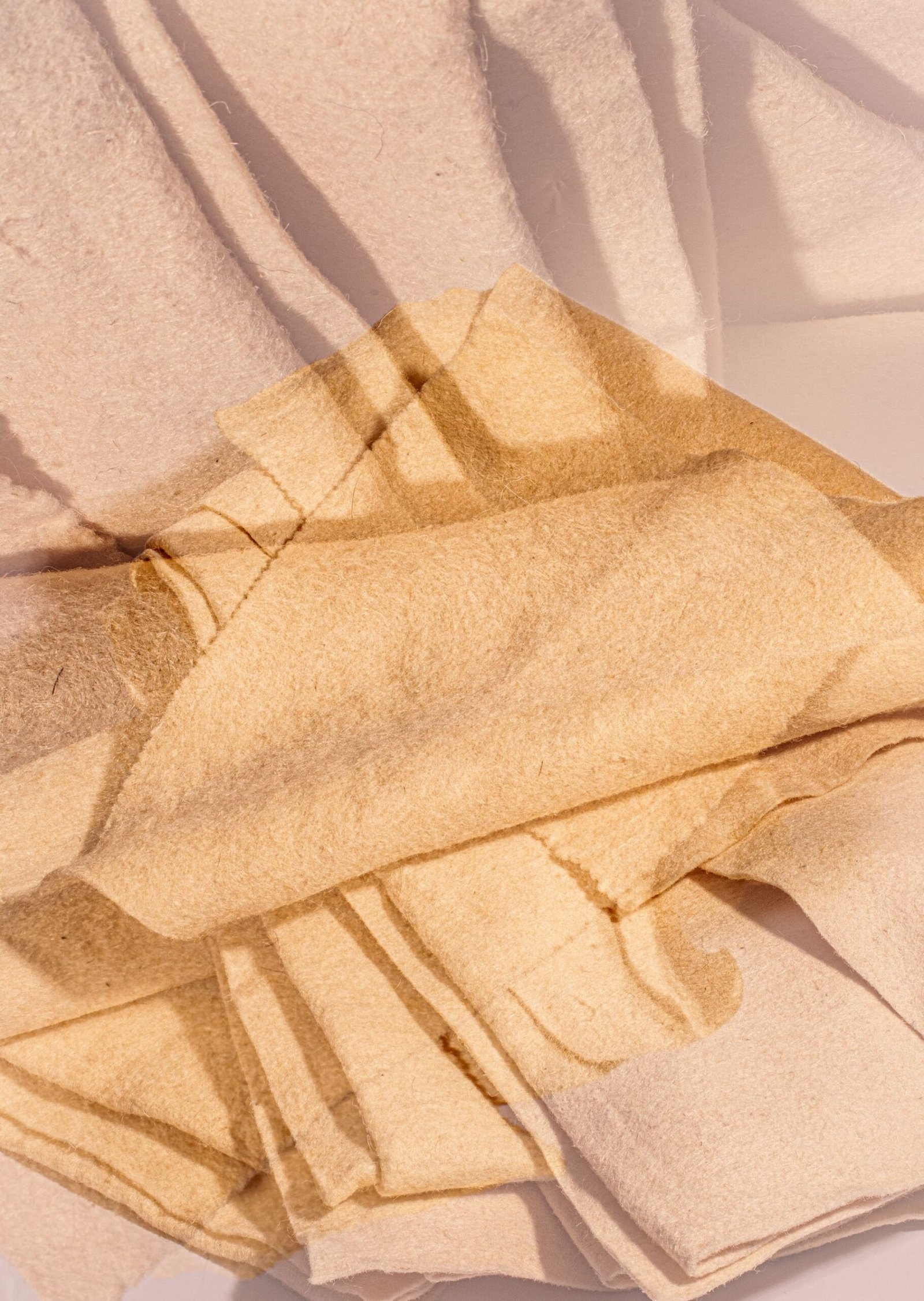 Selena Placino: It would be interesting to use the material as a finishing texture by mixing the fibers into wall paint or surface coatings to create a unique, tactile finish. I can also imagine it being used in architecture and interiors, especially for walls, partitions, or other surface applications.