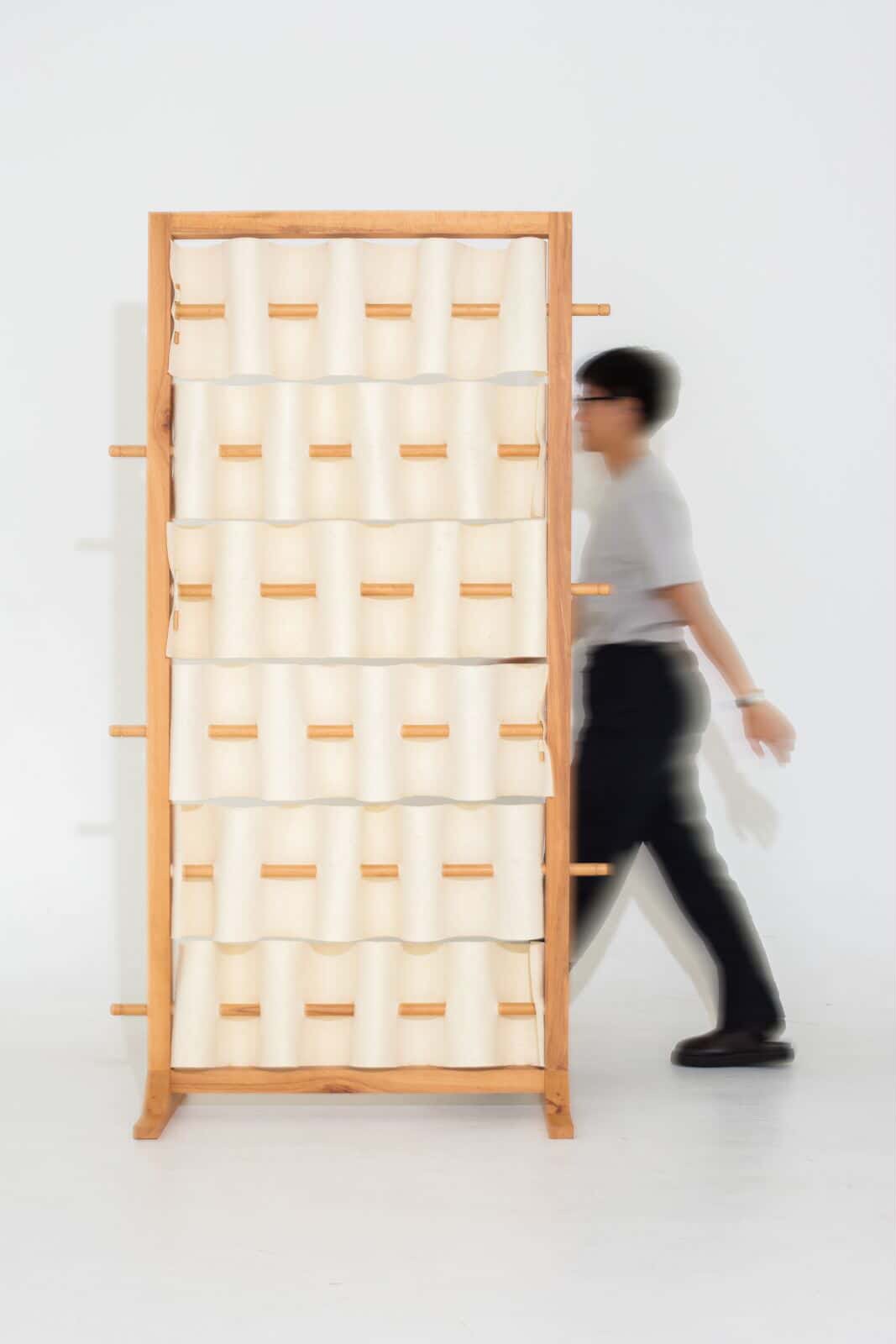 Ihawi is a room divider that combines subtle sound absorption with playful interaction. Crafted from Hiblatech’s dense, non-woven felt, it gently softens sound while filtering light. The panel’s gentle waves help soften and absorb sound throughout the space. Inspired by ihawan (grill) and the act of turning skewered food over a grill, the wooden rods allow the felt panels to rotate independently, enabling a dynamic play of light, shadow, and openness.