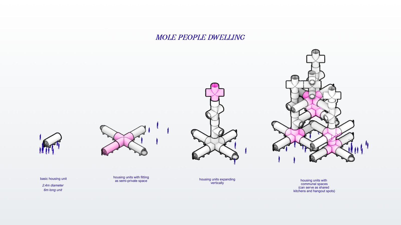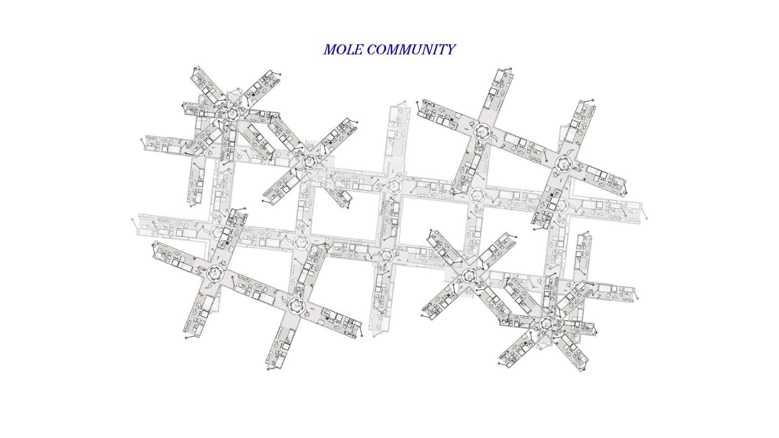 At the deepest level lies the Mole Community—an underground neighborhood designed for Makati’s urban poor. Shielded from the density above yet connected to its economic systems, this subterranean housing network offers dignified living spaces, communal facilities, and direct access to the campus’ markets, farms, and creative industries. A continuous network of pipes—carrying water, energy, waste, and even produce—acts as the project’s infrastructural language, stitching every layer together. Through this system, the campus operates like a living organism: food, power, people, and opportunity circulating between ground, sky, and soil. •