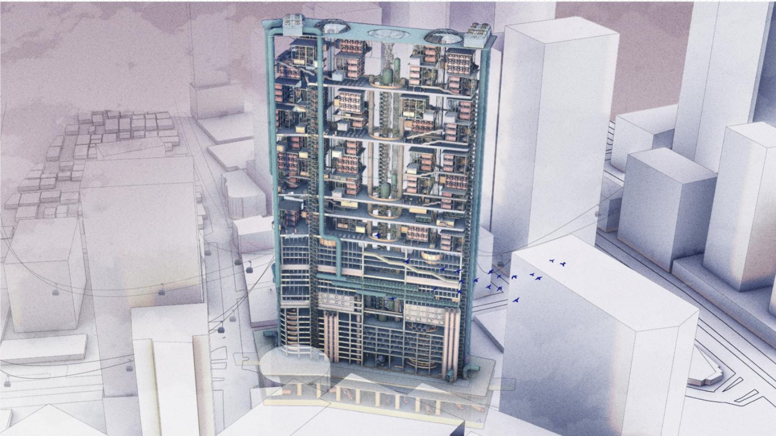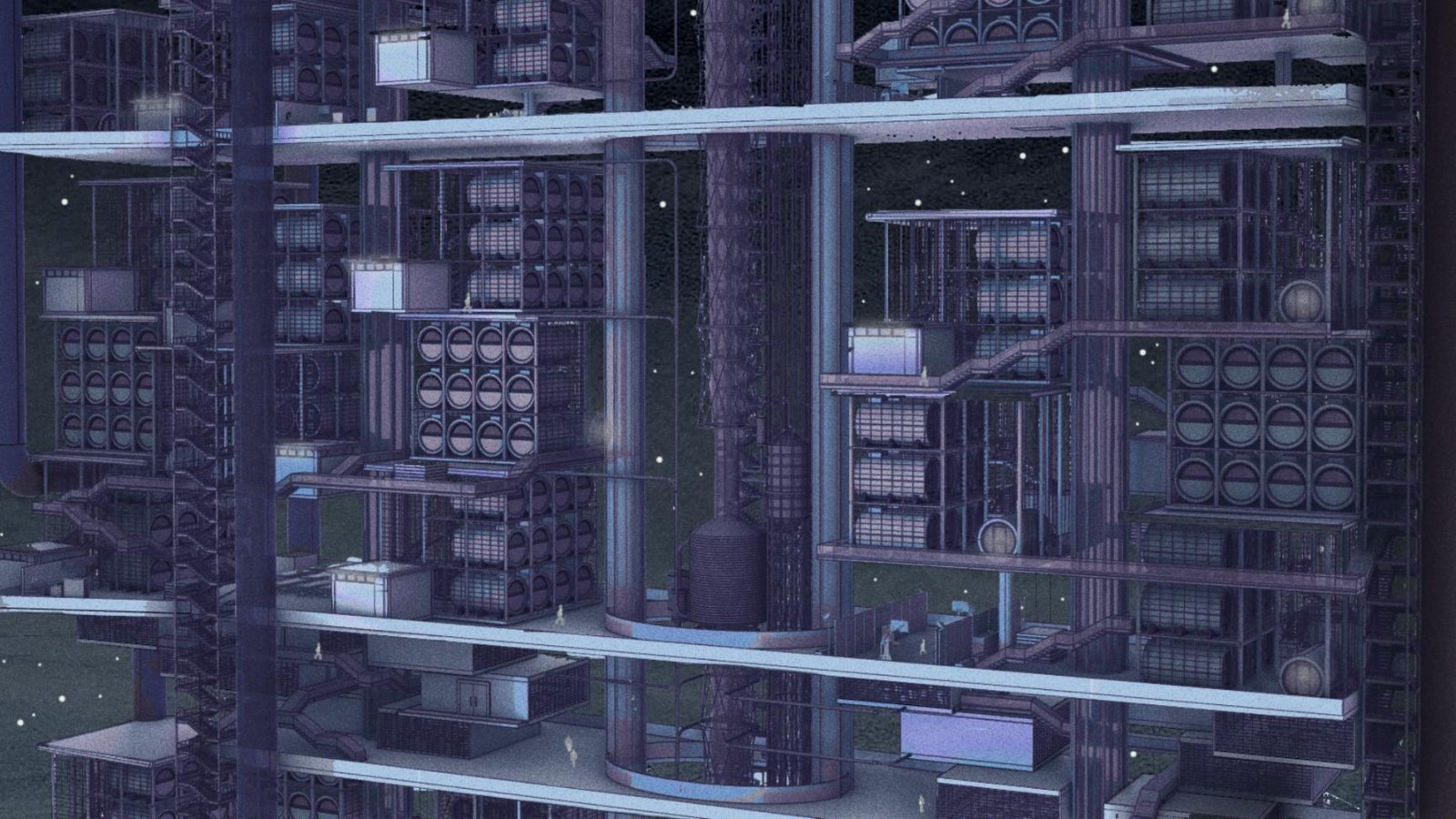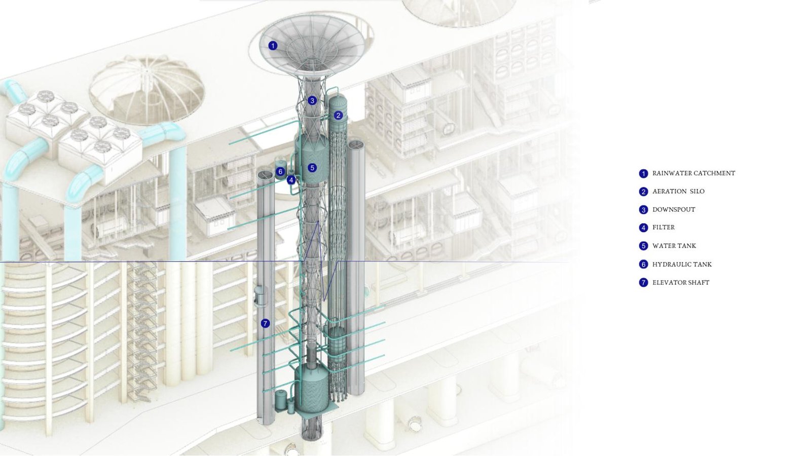 Binding these layers together is a vertical circulation spine: a cable car system that moves between floors, offering an alternative to conventional elevators while framing the campus as a civic journey through production, learning, and reintegration. Light travels with it through a network of solar tunnels that deliver daylight deep into the structure. Beneath the ground plane, hydraulic systems capture and convert underground water movement into supplemental power, reinforcing the campus’ ambition toward sustainable urban infrastructure.