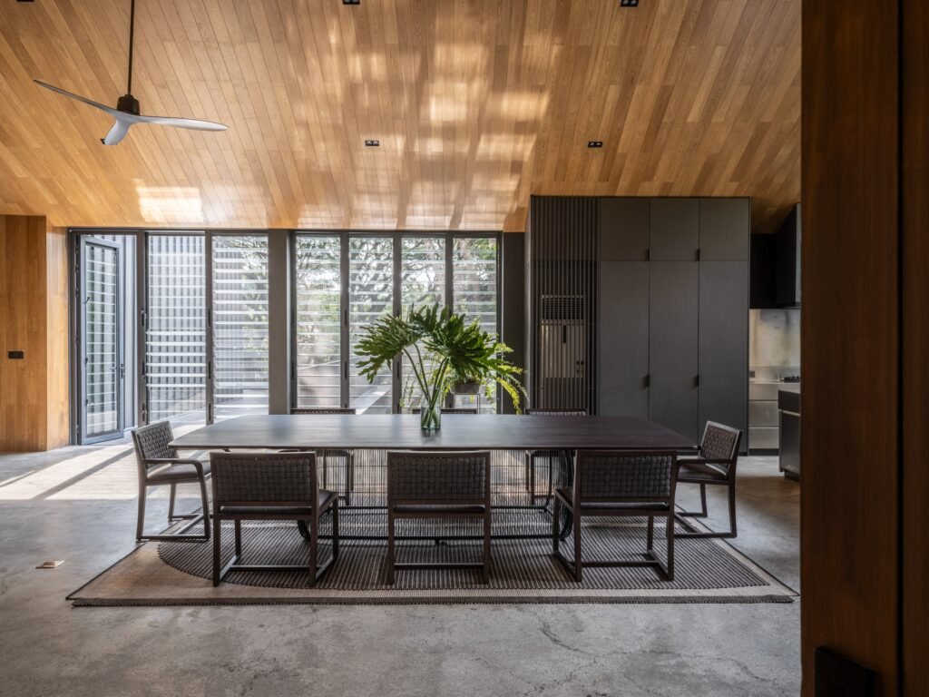 Three years after construction began, the family finally settled in. Since then, the house has gently shaped their routines: mornings start with coffee by the dining window, where birds dart across the canopy; evenings end in the living room, with the sound of the nearby creek filtering in between the open jalousie panes. The rhythm of their days has slowed, but in a way that feels unforced, almost natural.