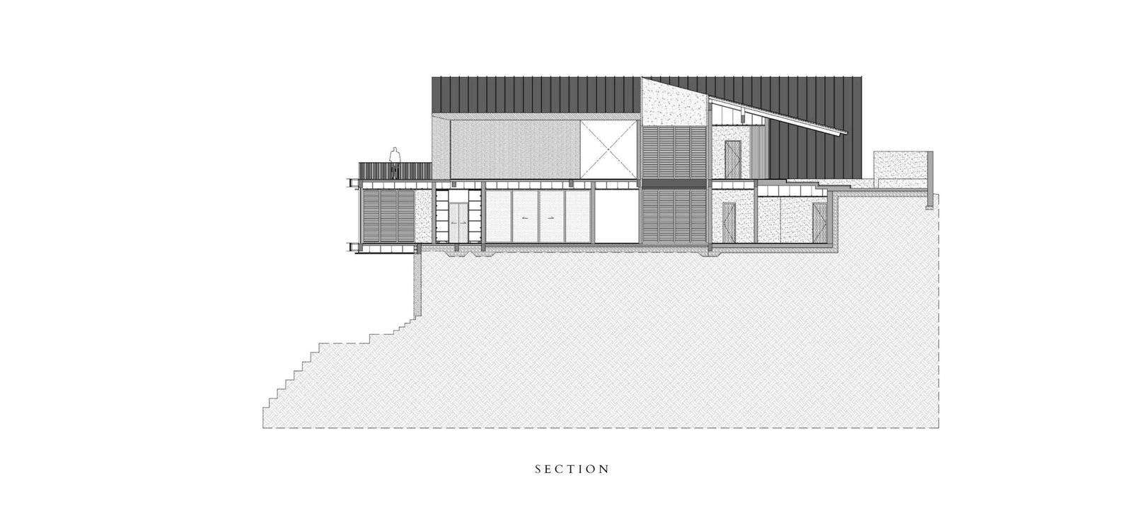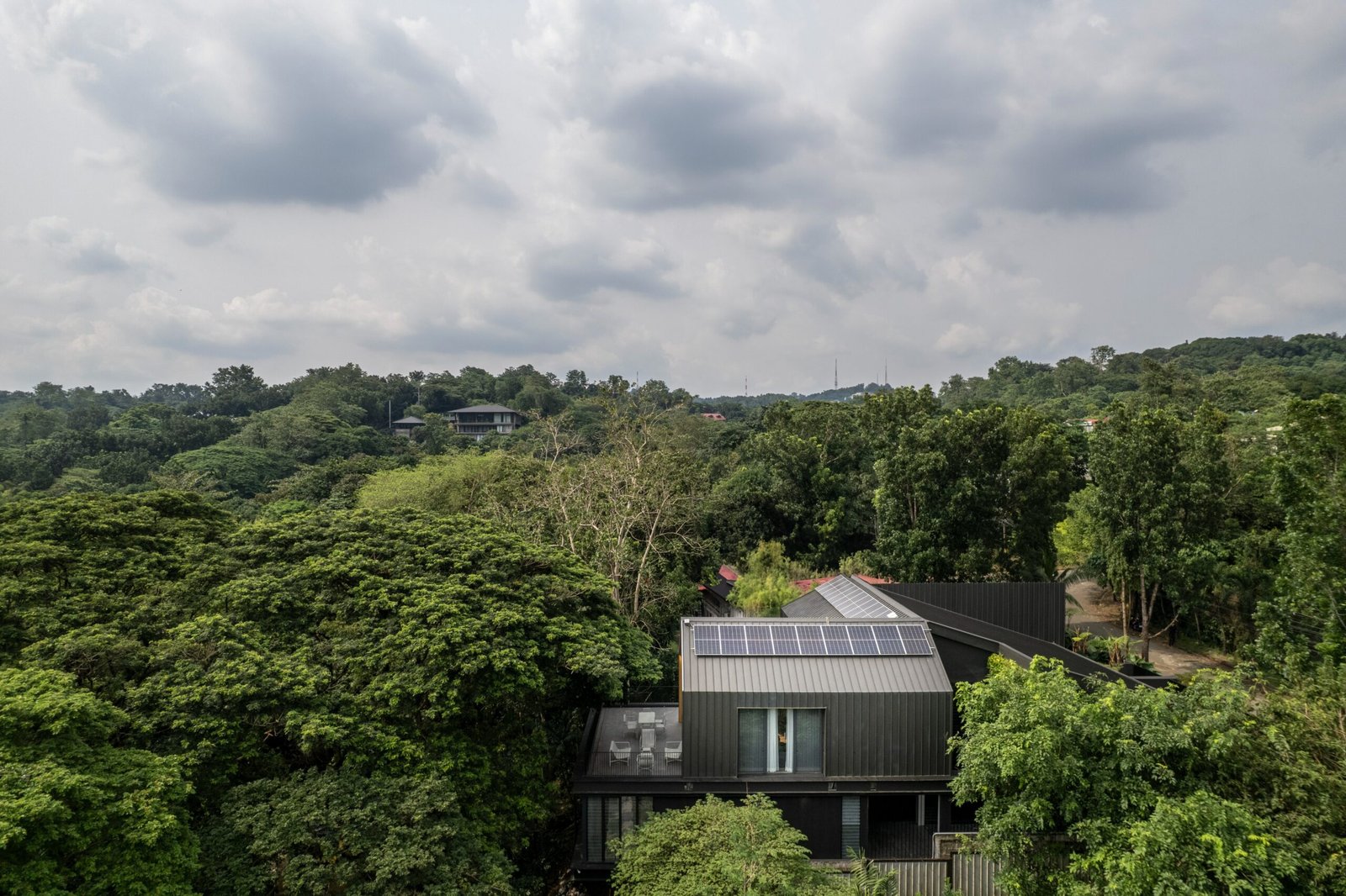 And what a surprise indeed: from street level, the house appears low-slung and closed-in, cutting a sharp presence with its black frame bent and folded, as if it were an oversized origami. The house seems to be almost all roof, with its black decking seamlessly cascading from top to side like a shroud; vertical wooden slats and an array of jalousie windows screen the porch and parking area, reminding one of a mountain cabin, albeit a modern one. While evocative of the type seen in coffee table books, Espiritu clarifies that the stylistic resemblance was incidental. “Evoking the highland cabin style wasn’t our goal,” he explains. “The final design, from material to form, is simply what works best with the site.”