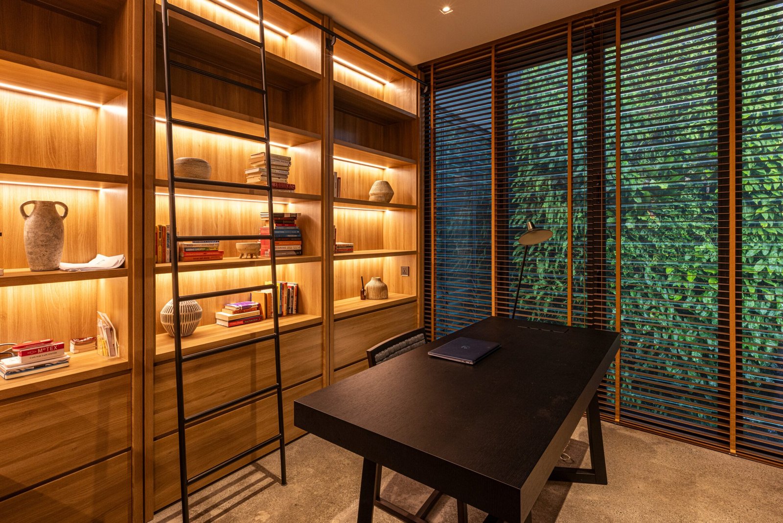 The materials mark time in texture: shadows on smooth concrete floors, warmth from the timber grain, and the faint sheen of glass where reflections shift through the day. Thanks to its wood ceiling and dark walls, the communal floor assumes a dual personality, drawn out by the weather: shadowy, warm, reassuring, and cocoon-like during rain showers (which is what greeted us during our ocular); light-filled, airy, and breezy on sun-drenched days, with all operable sliding and jalousie windows deployed.