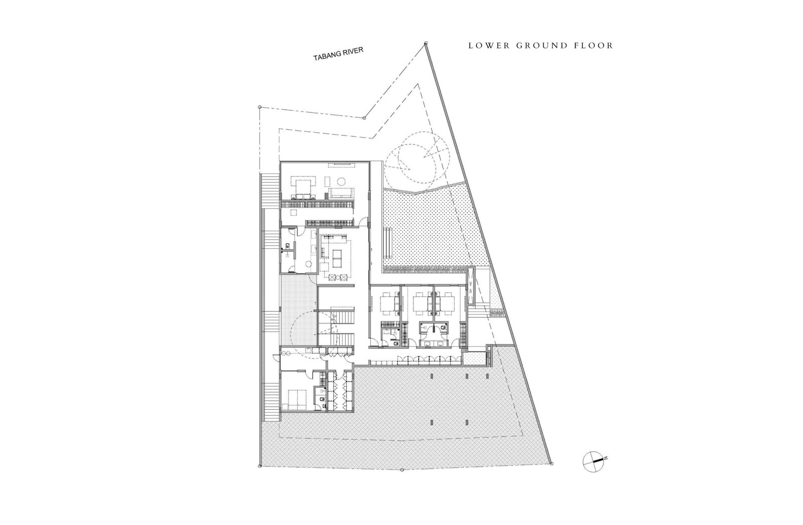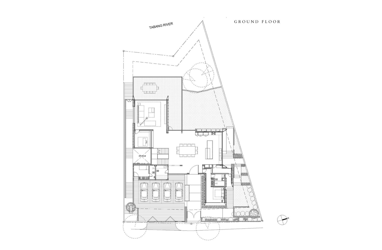On their first site visit, the PXP team, led by project architect Ron Lat, found a towering rain tree rising from the 930-sqm parcel’s downward slope. The tree’s canopy commands the immediate landscape, with broad branches extending out into the placid creek six meters below the home. This discovery set the tone for the project. The architects positioned the living room directly in front of the tree, framing it with a full-height window so the family could watch the light shift through its branches throughout the day.