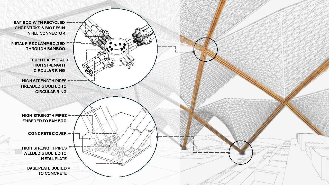 The bamboo roof is anchored to metal plates on reinforced concrete columns, with steel connectors for critical joints and other well-tested structural details adapted from earlier bamboo projects.