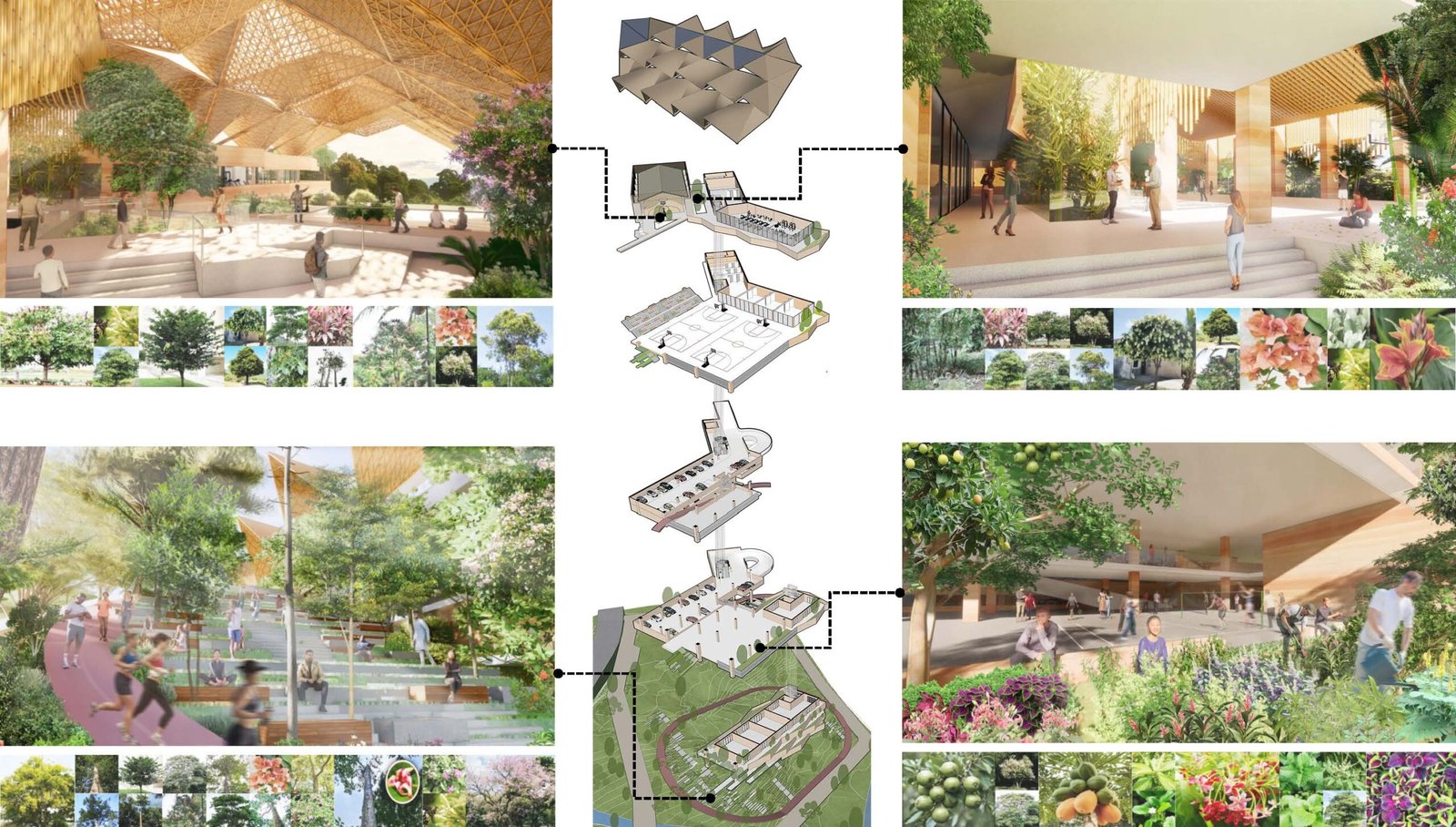 The site is naturally rich in bamboo, which will be harvested, treated, and used for the expansive sports hall roofing. Bamboo regenerates rapidly, reaching maturity in three to five years, making it one of the most renewable materials available. Its light weight reduces both labor and transport costs.