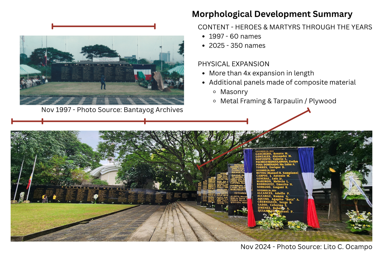 Annually, Bantayog honors new batches of heroes and martyrs through its continuing program and research. This ongoing work has also led to incremental physical expansion of the wall each year, resulting in overcrowding and unplanned growth over the years. Before the redevelopment, the wall had expanded four times its original length through freestanding expansions that honor 350 named heroes and martyrs, and is expected to continue expanding over the next ten years.