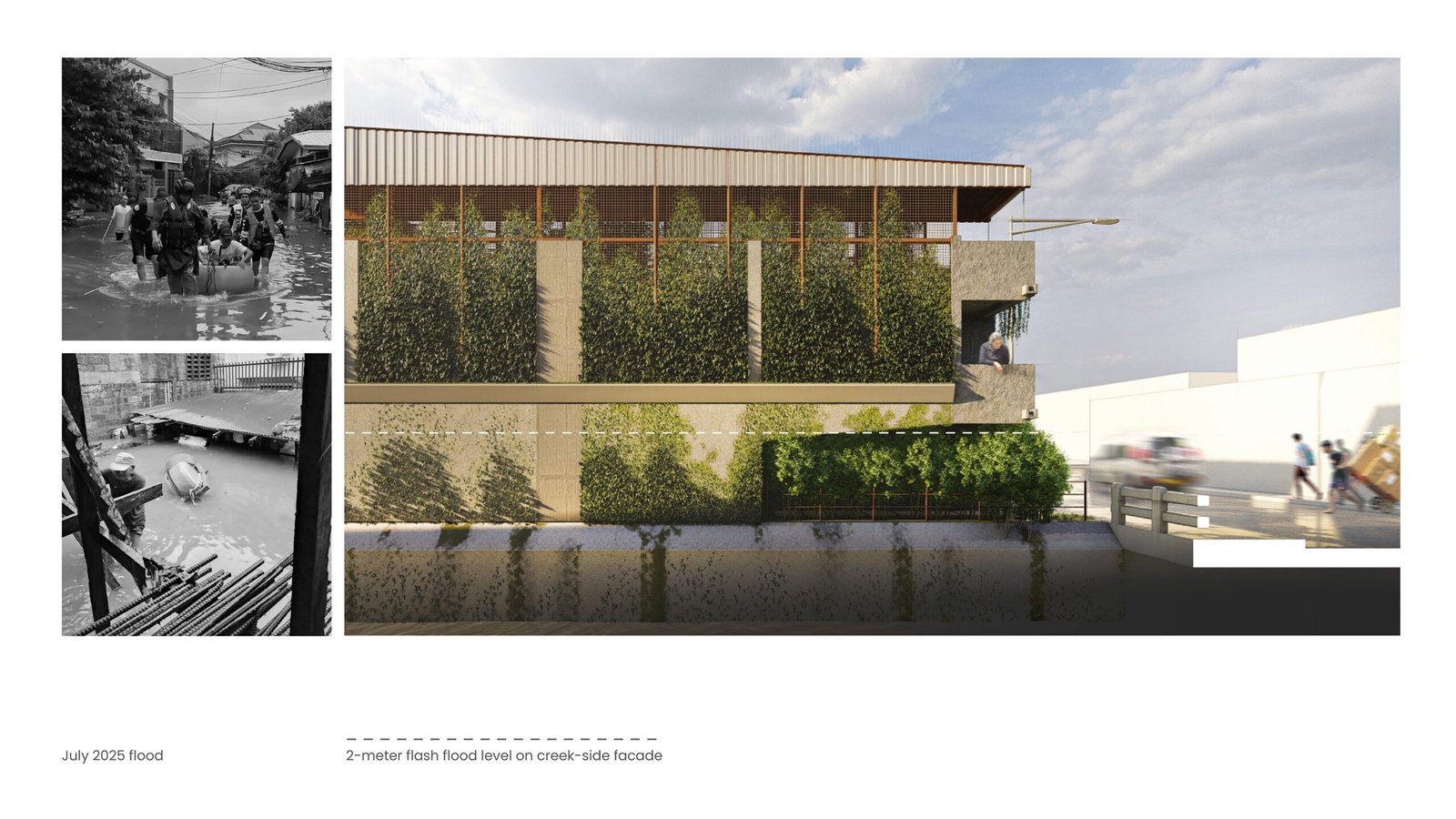 Entering through a narrow passage from the road, the sound of rustling bamboo leaves and rhythmic clacking allows the city to fade. The courtyard reveals a tree original to the site, retained as the institute’s symbolic center and natural anchor. It offers a quiet symbol of resilience, growth, and care. A waterfall masks neighborhood sounds, creating a soothing soundscape. The rest of the ground floor is reserved for rest and activity during the dry months, as the site sits in a two-meter flood zone. Interior spaces are raised on the second floor, accessed by a ramp that encourages both physical and mental deceleration. The meditation hall, dorm rooms, and support facilities emphasize material simplicity, grounding through floor seating and carefully calibrated openings for ventilation, light, and mental anchoring.