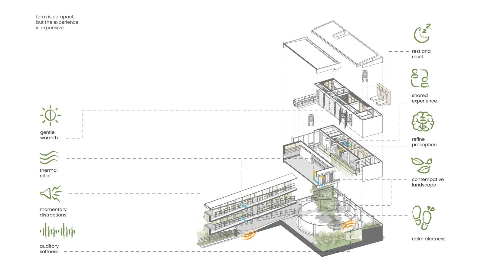 Eldry Infante and Martin Quiambao, Mede Studio: Hello, Kanto! Thank you for the opportunity to talk about Limlim Mindfulness Institute. Yes, architecture can only go so far—but its potential to heal and comfort is what excited us as designers. The Institute’s “curriculum” is composed of evidence-based programs with a set of activities that enable individuals to develop a mindfulness tool set tailored to their specific needs, such as relapse prevention for mental health problems, stress and emotional regulation, or general well-being improvement. These tools are meant to integrate seamlessly into daily life, not as scheduled activities, but as natural responses to stressors in the environment or the mind.