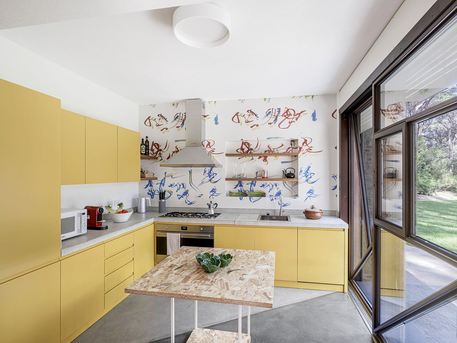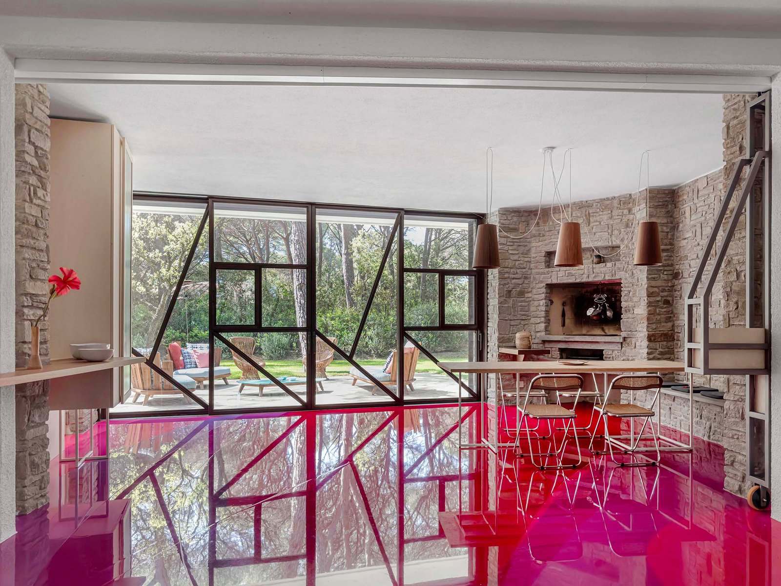 The color palette, a vibrant, energetic contrast to the house’s earthy shell, was chosen to highlight the villa’s features through reverberation. The resin is so brightly saturated and shiny that it acts like a mirror; when the sun bleeds through the pines, the floor pulls the forest inside, reflecting iridescent arboreal views below the bleached maple furniture, the OSB-topped dining table, and folding wicker chairs. This “liquid” floor creates constant indoor-outdoor interaction, a dominant feature that makes the heavy sandstone walls feel as though they are hovering over a multicolored pool of light.