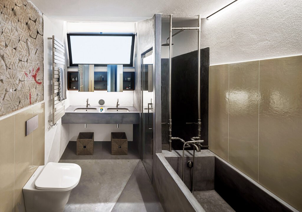 The bathroom, with its utilitarian finishes