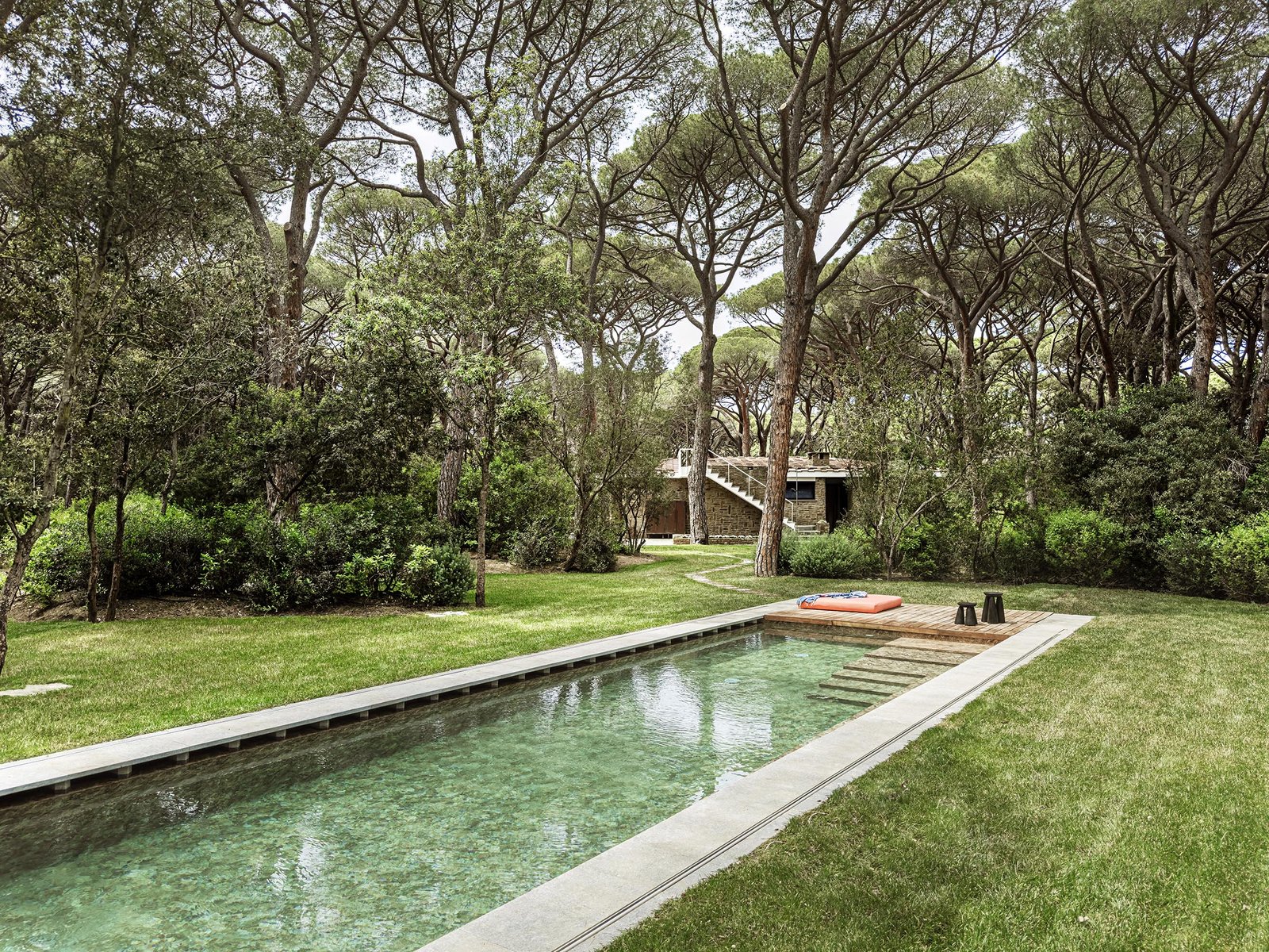 VMCF Atelier restored the villa’s sandstone façade, integrated a rainwater cistern for the garden and swimming pool into the terrain, acting as much as arborists as architects, tending to the tall maritime pines while planting native cork, strawberry, and mastic trees.