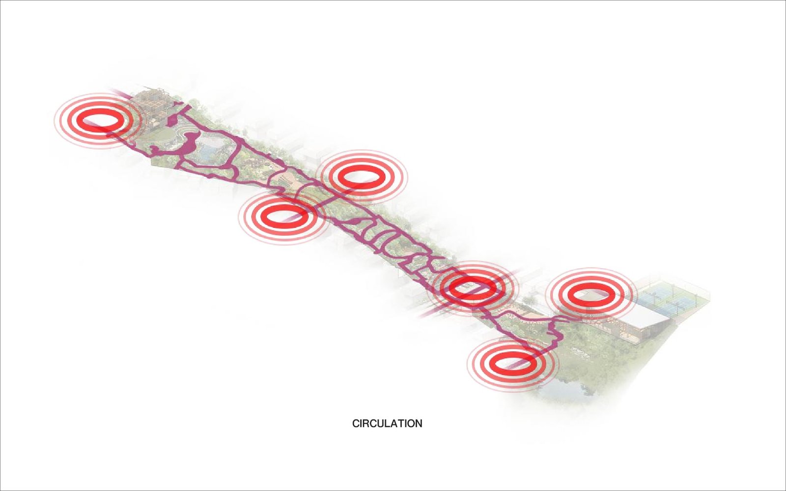 To further manage runoff, we integrated a canal system designed to resemble a pebble-bed stream that traverses the site from top to bottom. This stream serves a dual purpose: cooling the surrounding parks and open spaces through evaporative cooling, while also acting as a rainwater collection system that directs excess runoff into a detention pond at the foot of the hill. When filled, the pond takes on the scale of a small man-made lake, ensuring that excess runoff is contained within the site and released gradually into the city’s sewer system.