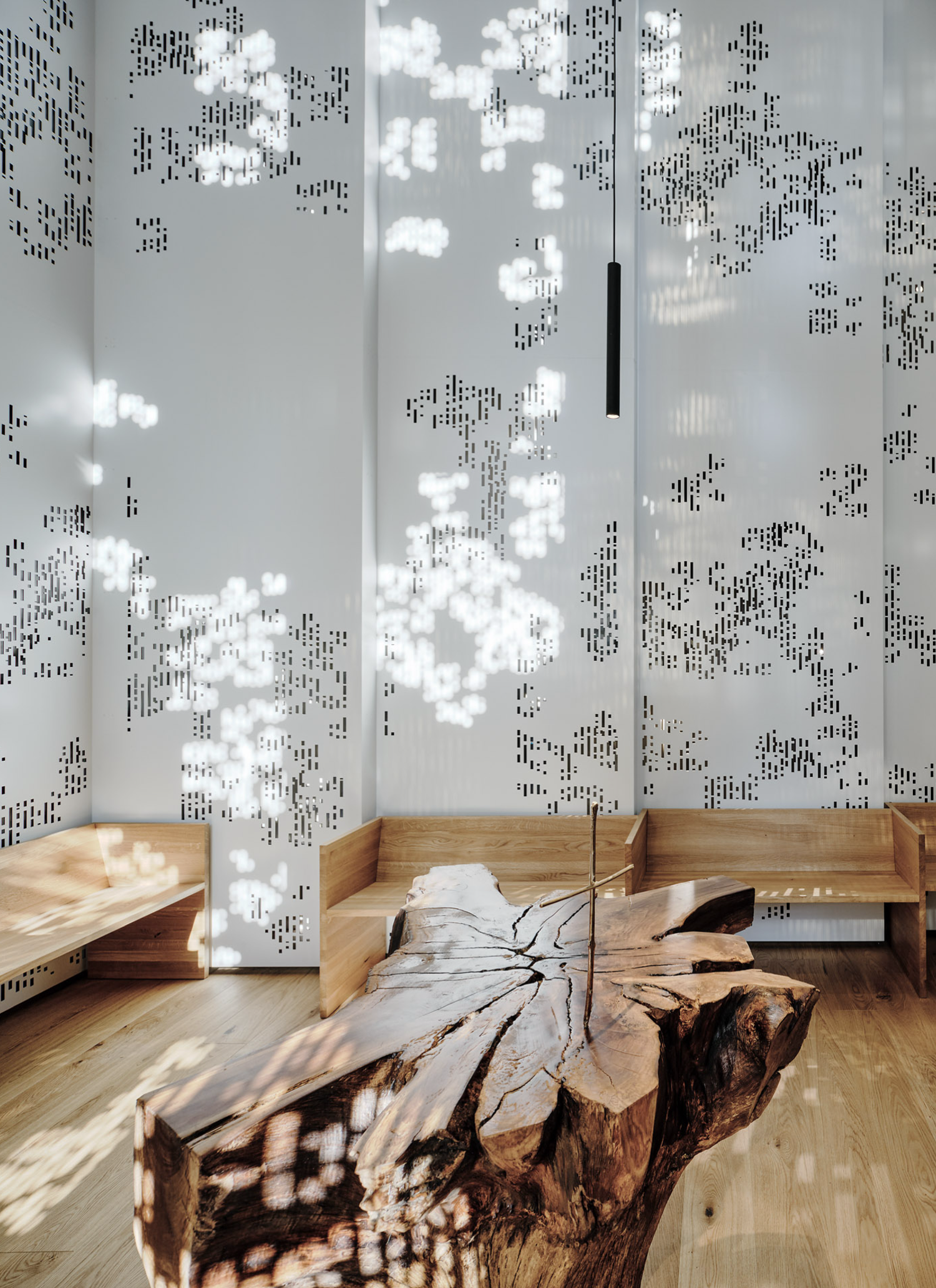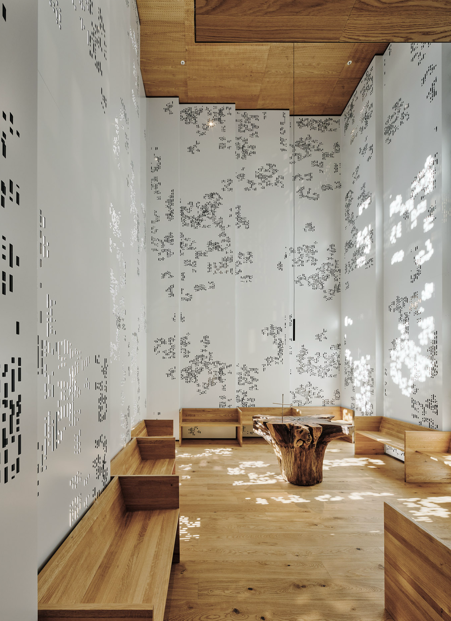 The material palette of the chapel remains minimal to emphasise the interplay of pattern, form, and light. Wood is used for the ceiling, flooring, benches, and altar, contributing to the space’s warm, earthy character. This choice allows the fractal patterns and natural elements to remain the focal points. Covering 35 square meters, the chapel features a double-height ceiling and a room-high glass façade. Following principles of religious scenography, the low entry area opens into an 8-meter-tall space, creating a dramatic yet calming experience. At the heart of the chapel is a unique altar created by a renowned Austrian sculptor from the inverted rootstock of a walnut tree. Surrounded by fractal surfaces and enhanced by refined lighting, the altar invites moments of introspection and contemplation.