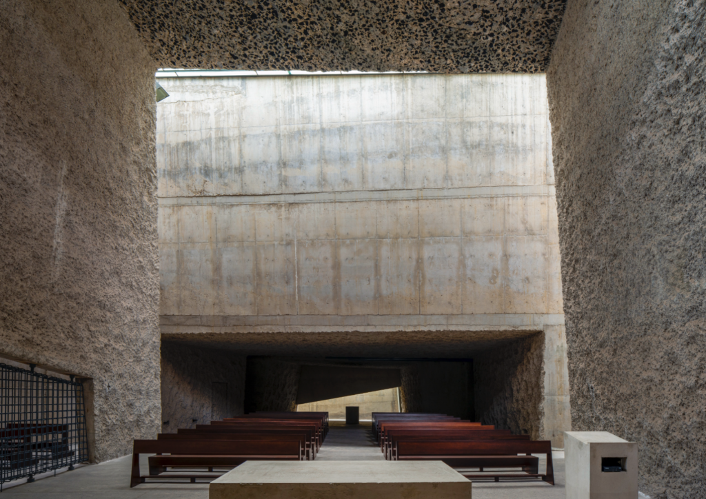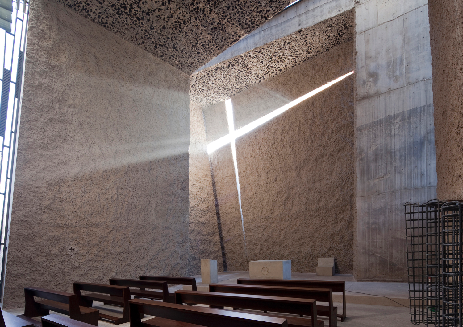 Daylight is as a key architectural element, shaping an introverted, austere space that invites reflection. Without windows, the building is illuminated by the unglazed cross and zenithal light. Throughout the day, the shifting light highlights different areas, guiding users through their interior exploration.