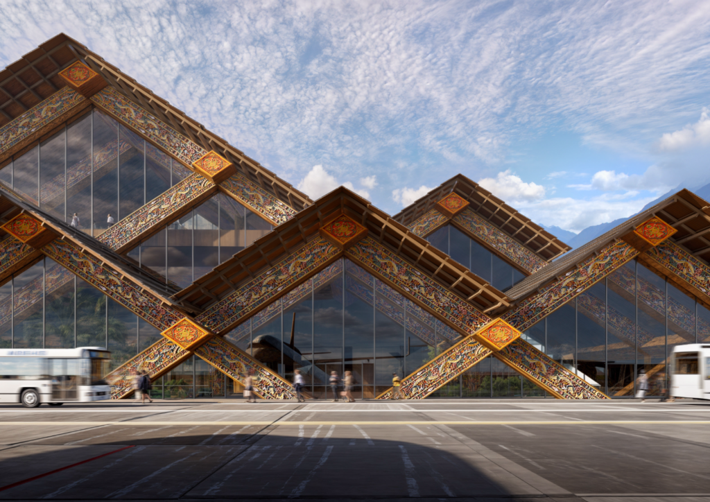 The terminal’s striking diagrid structure is built from locally and sustainably sourced timber, adorned with traditional Bhutanese wood carvings. Its painted façade references the Kachen, a sacred structural wooden pillar, fusing spiritual symbolism with architectural heritage. The timber structure helps regulate indoor humidity, while ventilated roofs and courtyards promote airflow. Extended eaves offer shade and protection from monsoon rains.