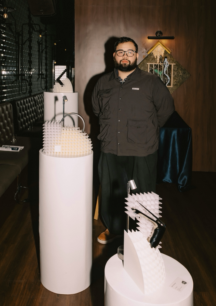 Alvarez opened the program with Gridnest, a series of 3D-printed substrates that reimagine the relationship between Kohler’s Avid and Components faucet collections and their surrounding forms. Using plastic as a counterpoint to polished metal, he encased silver and matte-black faucets in a sculptural waffle-weave. The white grid amplifies the faucets’ silhouettes, allowing their geometry and finishes to shine. “I wanted the pieces to feel like the faucets were being held, not displayed,” he shared. “The grid softens the metal’s authority and invites you to see the object beyond its function.”