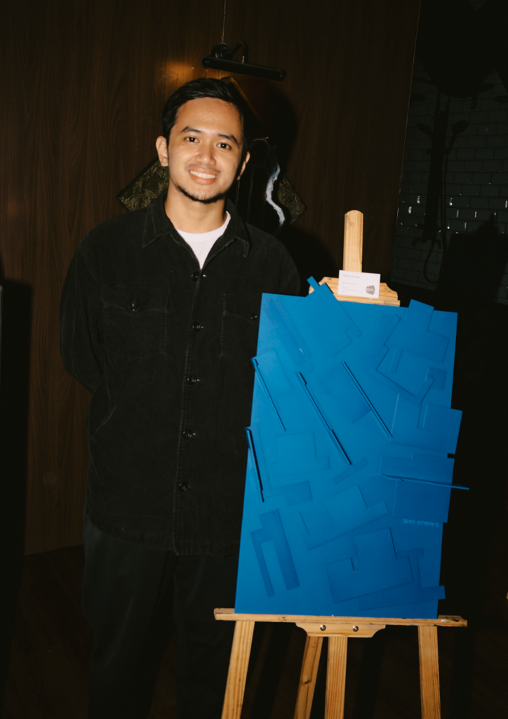 Last to present was Ravago, who introduced his piece Between Flatness, crafted from laser-cut medium-density fiberboard (MDF) finished with layers of lacquer spray. Primarily a painter, he shared that this was his first time working with the material and technique. Through this shift, he set out to explore an experimental, almost abstracted reading of water. “Trying MDF and laser-cutting opened new ways for me to think about how water can look and behave.”