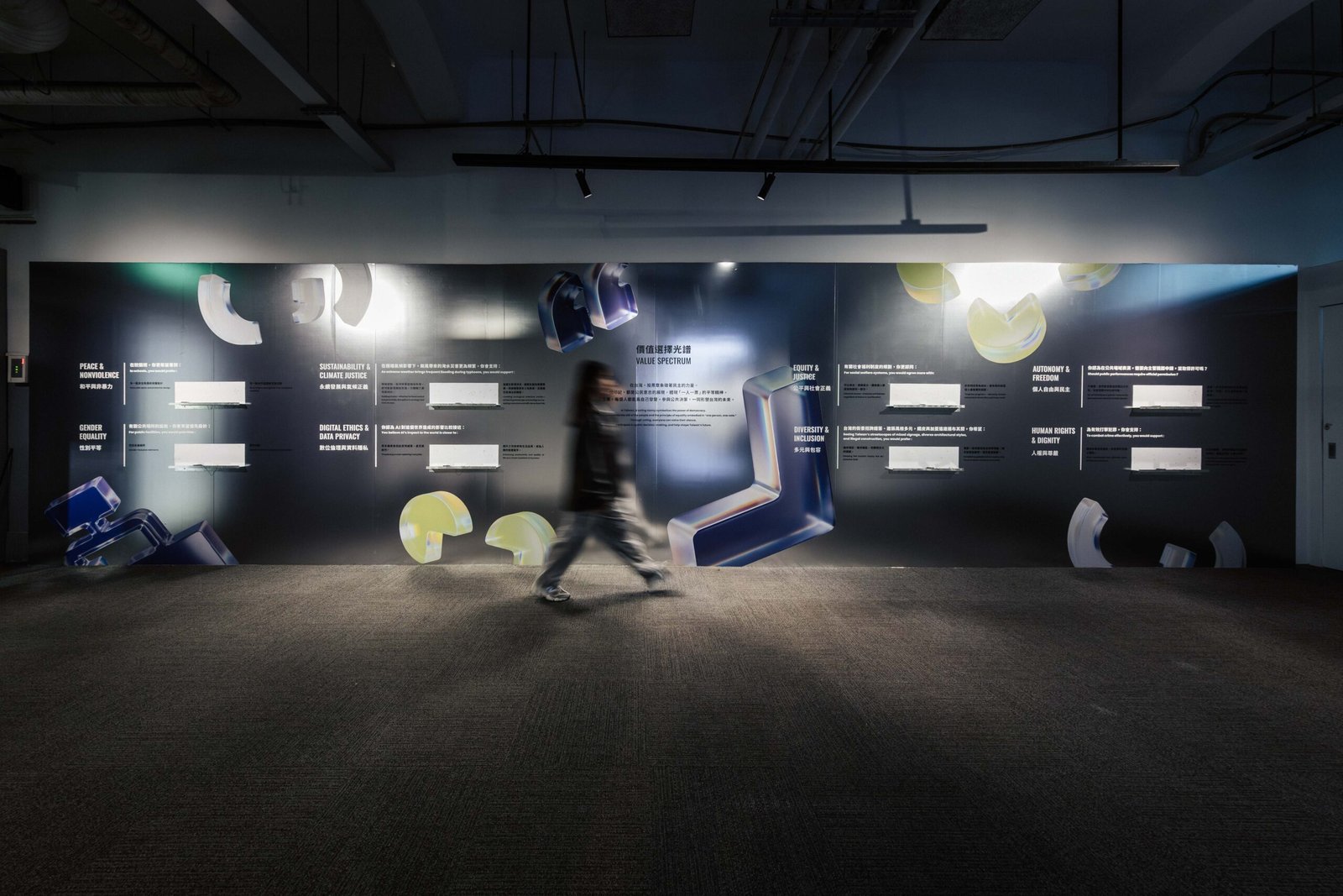 The exhibition design possesses spartan, scaffolding-like forms and dark panels, a stark contrast from last year’s flashy, high-tech offering. Parallel arrays of booths are cleaved at the center by a light installation lined with more than 80 inventions shaping human existence. Approaching the final wall, two questions jolt the visitor: for whom are we designing a better world? And what values should guide those decisions? With these queries in mind, they are subtly pulled to the Value Spectrum wall. Mirroring the island nation’s election act of stamping ballots, visitors take their pick from eight design values they believe should shape Taiwan’s path forward.