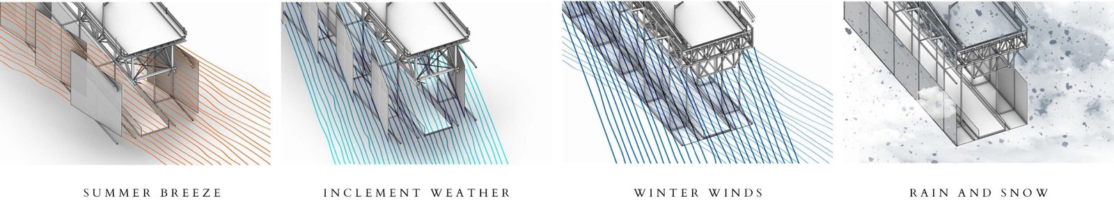 The Voyager anchors this outdoor theater: a system of wind-responsive panels and retractable seating that adapts to climate and performance needs. Performances unfold against shifting backdrops, with seating that retracts to reveal a multi-use space. When not in use, the panels serve as projection surfaces, generating additional revenue. The theater and adjacent venues, including the Café and Welcome Center, support local employment and contribute to the city’s cultural economy.