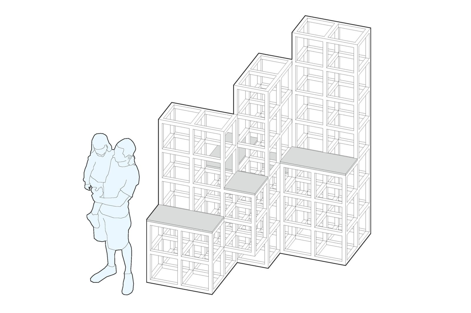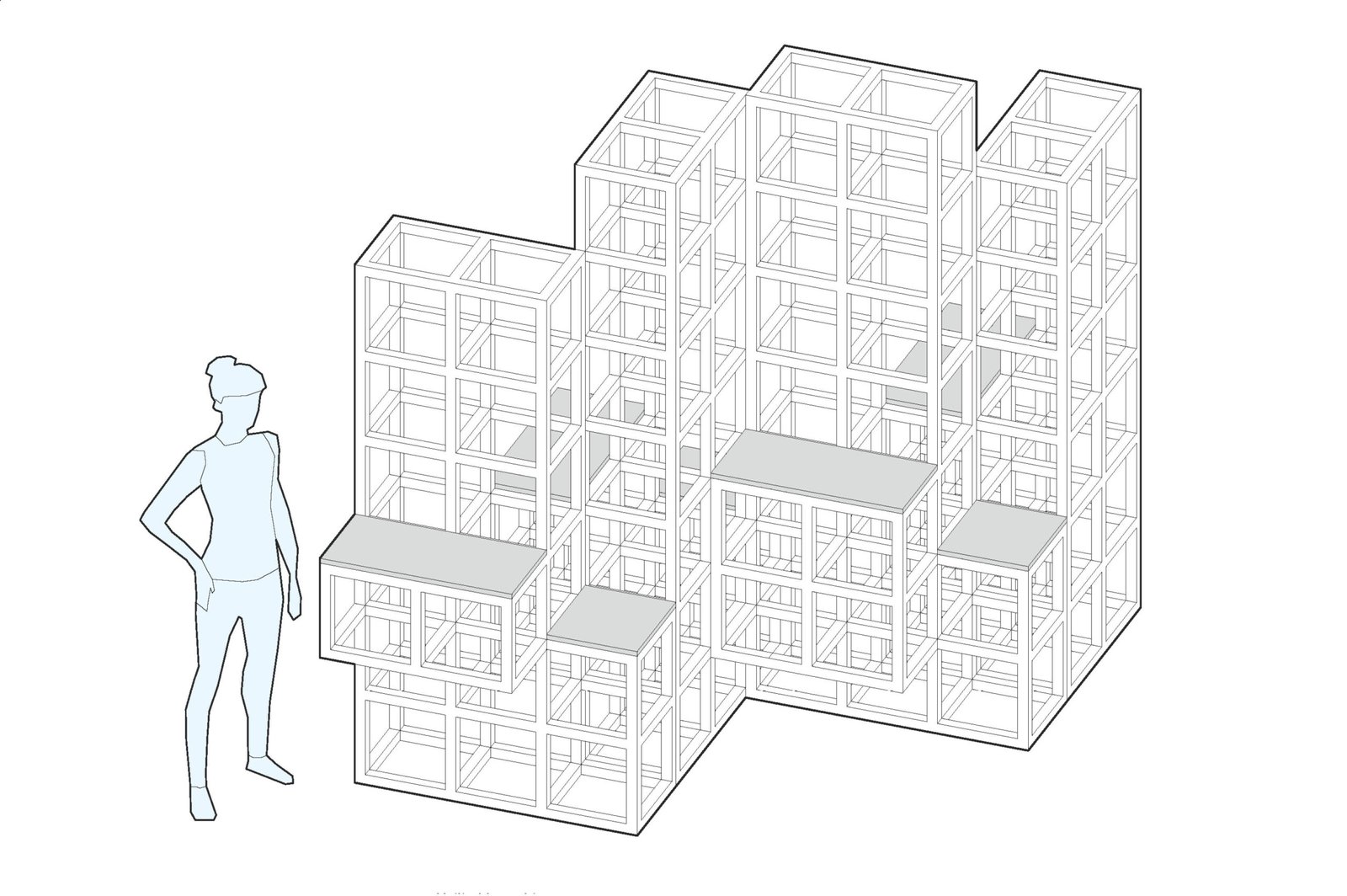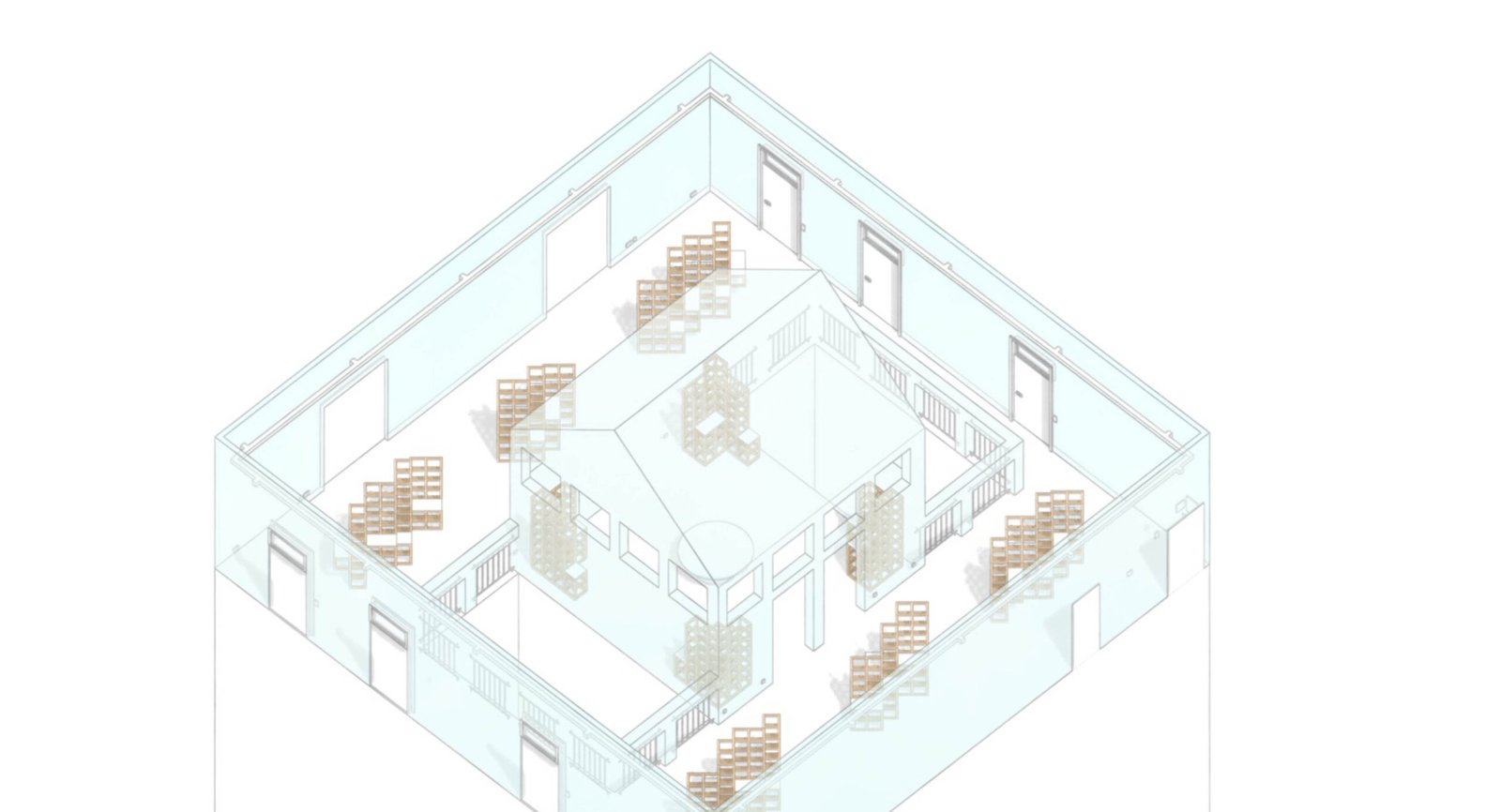 In conceptualizing the exhibition design, I was similarly reflecting on what it means to design something new within a canonical postmodern space. The third-floor exhibition space was bright and airy, bathed in light from the skylight above.  I approached the exhibition design as simultaneously a homage and a contrast to O.M. Unger’s design, which is this white cuboidal house set within a historic shell. I wanted to translate the idea of water currents within Unger’s pristine orthogonal space through zigzagging wood-frame structures, emulating an ocean wave in a pixelated, grid-based form.