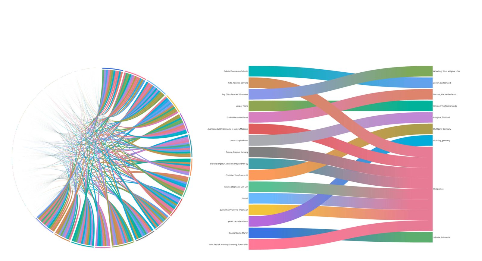 Closeup of Nexus chord diagram generated by Bien Alvarez, containing the names of all exhibitors and points of connections and diversions between them